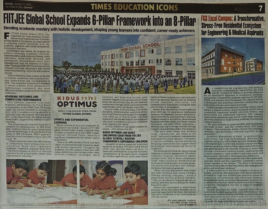Chennai, Tamil Nadu (February 02, 2026) – FIITJEE Global School Chennai has been recognised as an Excellent School (National) in the South Zone at the Times Education Icons 2025-26, Chennai Schools, Pre Schools and Education Institutions Survey.