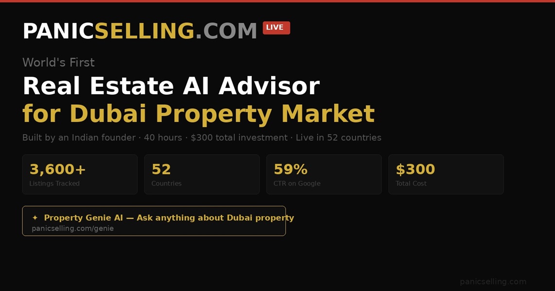 PanicSelling.com surfaces listings where sellers have already reduced their asking price by 5% or more, giving buyers a negotiation starting point that was previously invisible. Property Genie adds a conversational layer — buyers can now ask about LRS remittance limits, Golden Visa thresholds, DLD costs and negotiation tactics in plain language, and receive answers backed by live market data.
