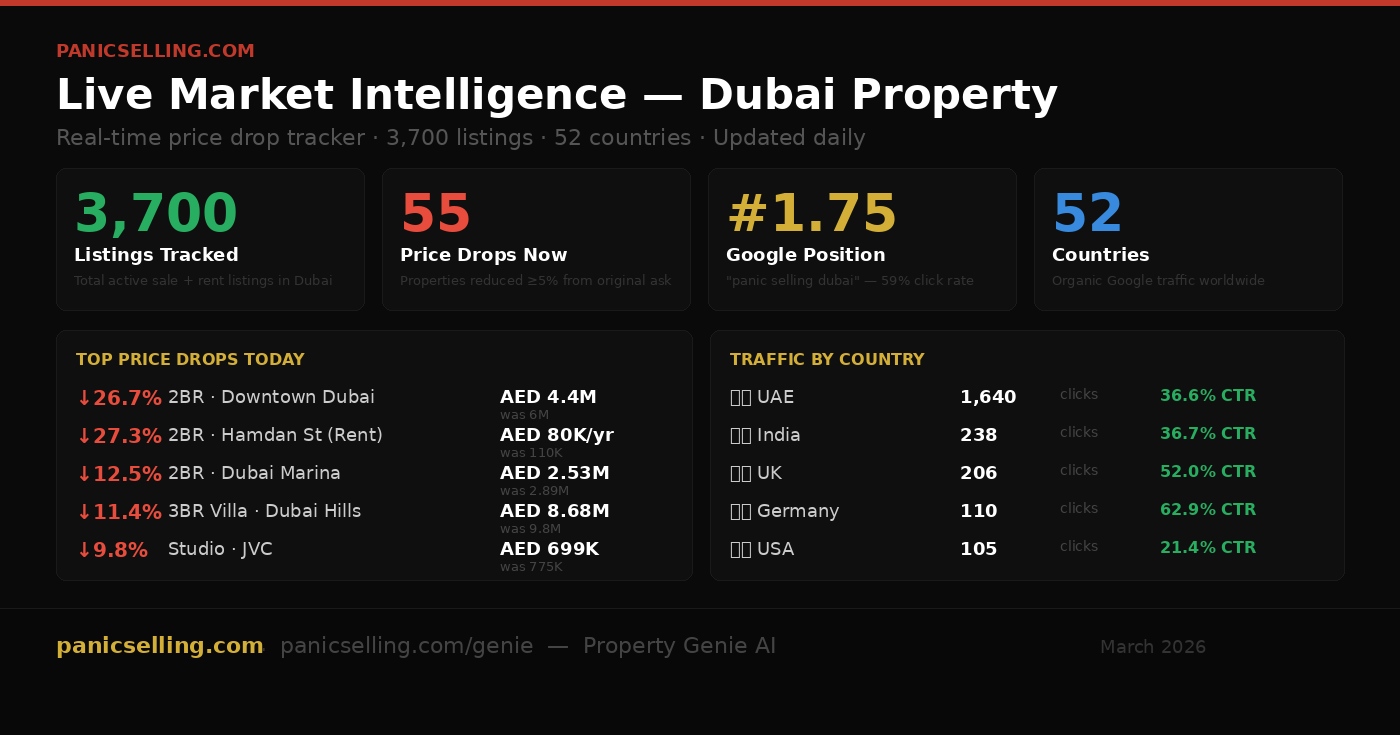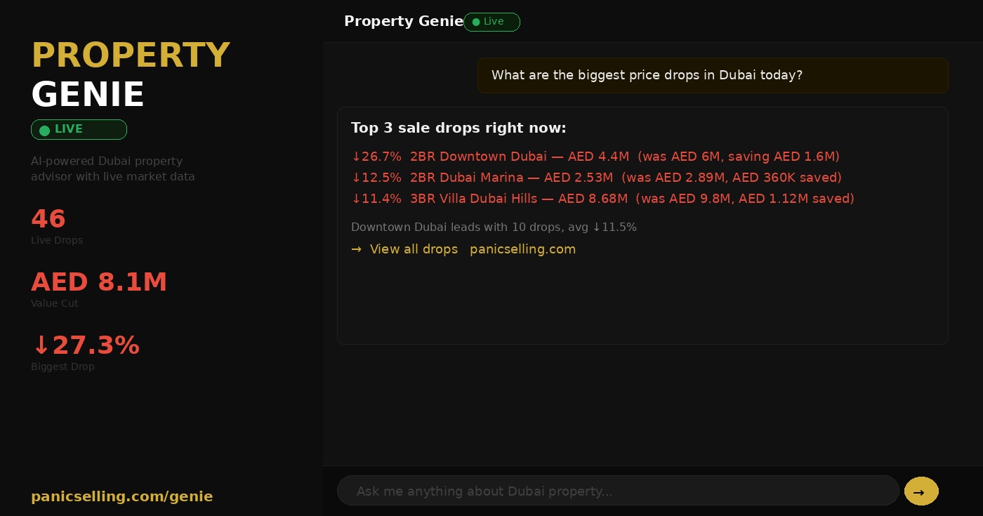 Property Genie, now live at panicselling.com/genie, answers visitor questions about Dubai real estate using live data from over 3,600 tracked property listings — updated every 24 hours. Unlike generic real estate chatbots, Property Genie knows today’s actual price drops, which areas have the most motivated sellers, and what the market looks like right now.